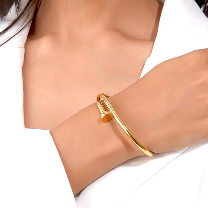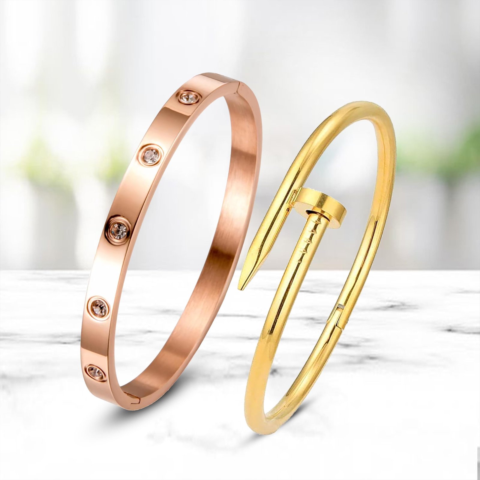 • Anti Tarnish Jewellery | 18K Gold Plated Stainless Steel Openable Crystal Bracelet | Latest Stylish Cuff Bangle | Love Friendship Couples Gifts for Women Girls Mother Sister Wife Girlfriend Gold Plated Fashion Jewellery Stainless Steel Anti Tarnish Cuff Band Style Bangle Bracelet And Nail Style Combo Pack of 2 with White CZ Stones For Girls and Women