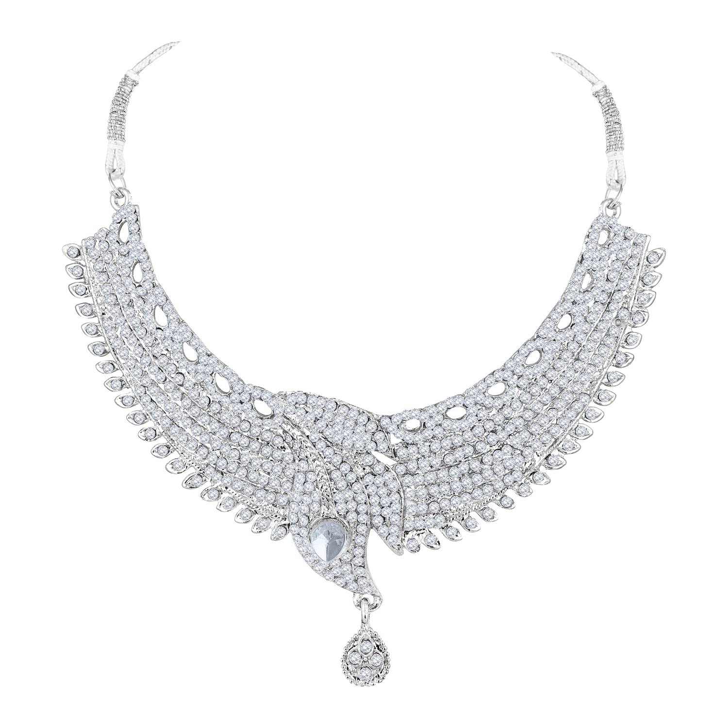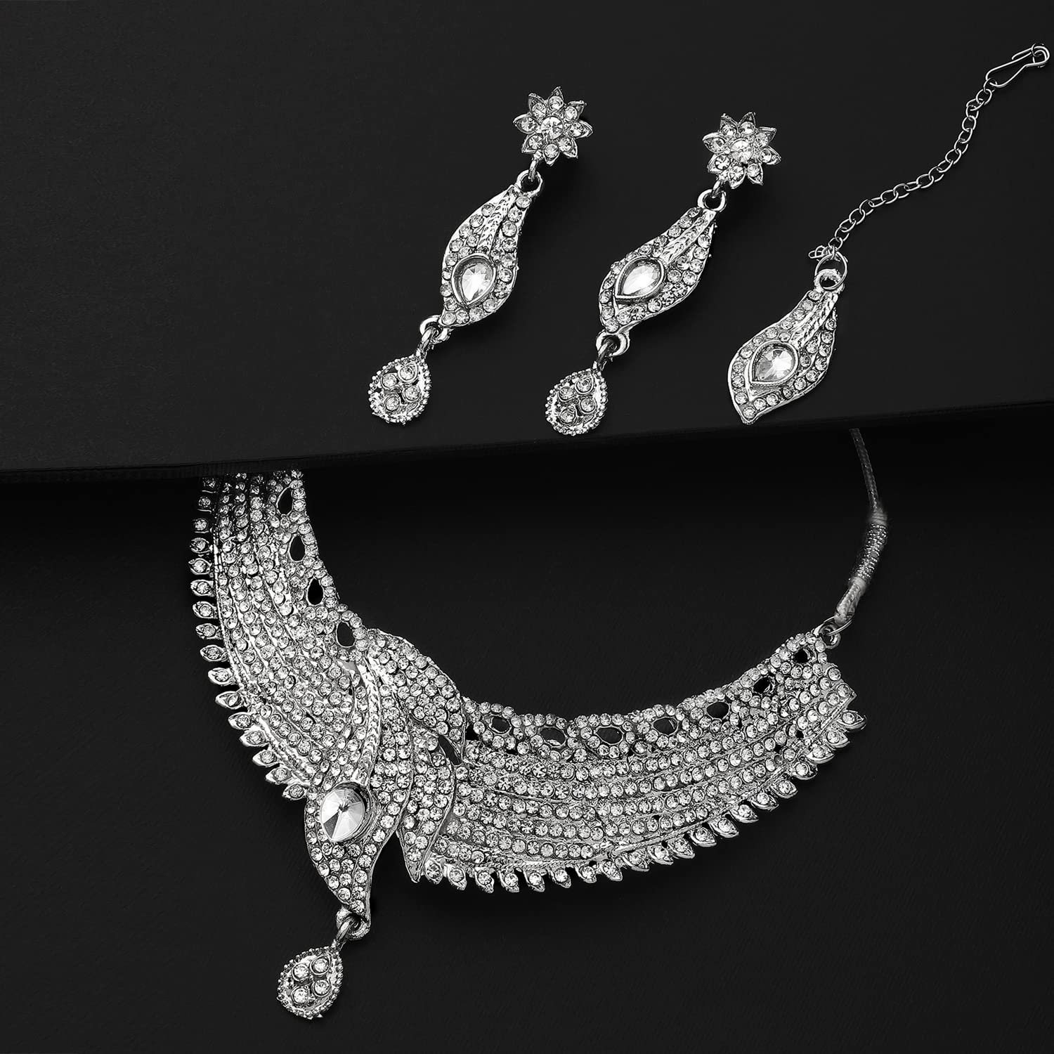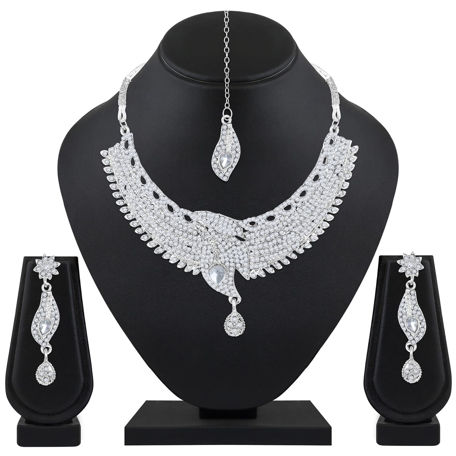 Shining diva presents this latest american diamond silver plated jewellery set stylish necklace set for women. This casual, festival or wedding party wear necklace set for women with maang tikka and earrings is made of fine quality material which looks stylish and goes perfect with any attire. This traditional choker necklace set is perfectly suited for wedding or party wear. Shining diva is a well known brand across fashion jewellery sector. shining diva has huge collection of latest statement haram necklace jewellery, traditional necklace set, south indian type Lakshmi temple pendant set and other jewellery accessories which includes fancy bangles for women, wedding bangles, ear cuffs, traditional bangles kada, neck choker, fashion party wear necklace for girls and jhumki jhumka earrings. shining diva is pioneer of imitation jewellery and design pearl necklace set for women and american diamond hangings party wear stylish earrings. shining diva fashion and traditional jewellery give true value for your money. buy shining diva trendy artificial jewellery from amazon in offer. these are also ideal for special birthday gifts for girls, wife, love valentine gifts for girlfriend, wedding gifts and anniversary gifts.