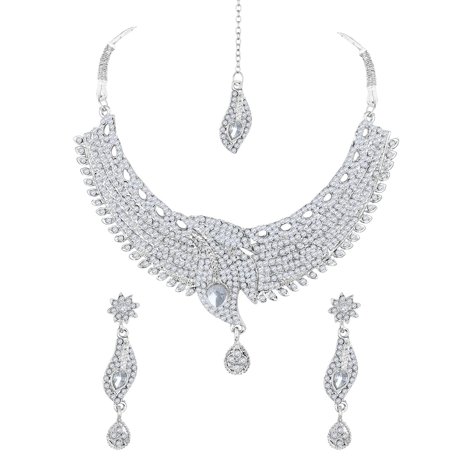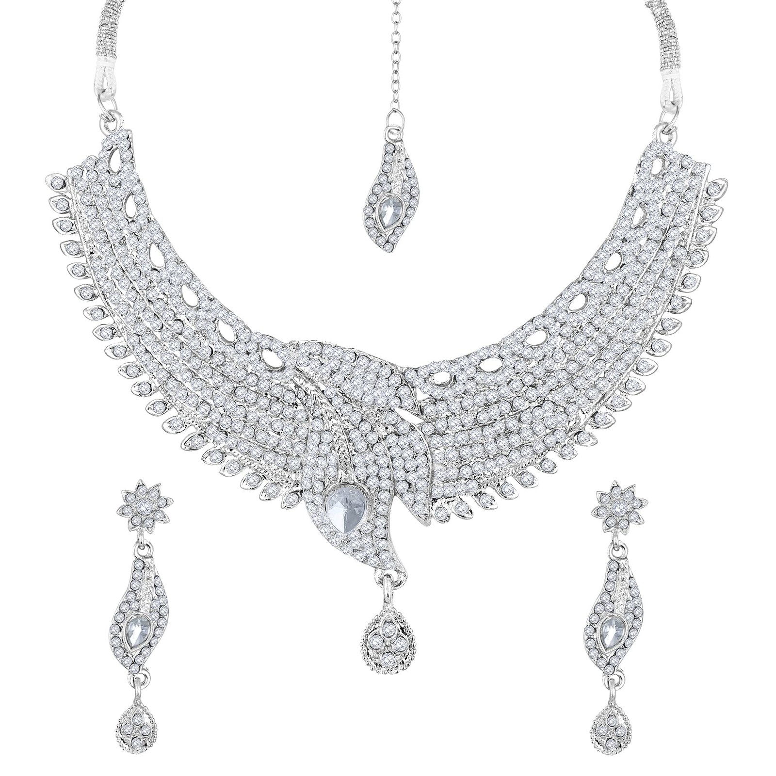 - Latest silver plated diamonds studded necklace jewellery set with maang tikka and earrings
