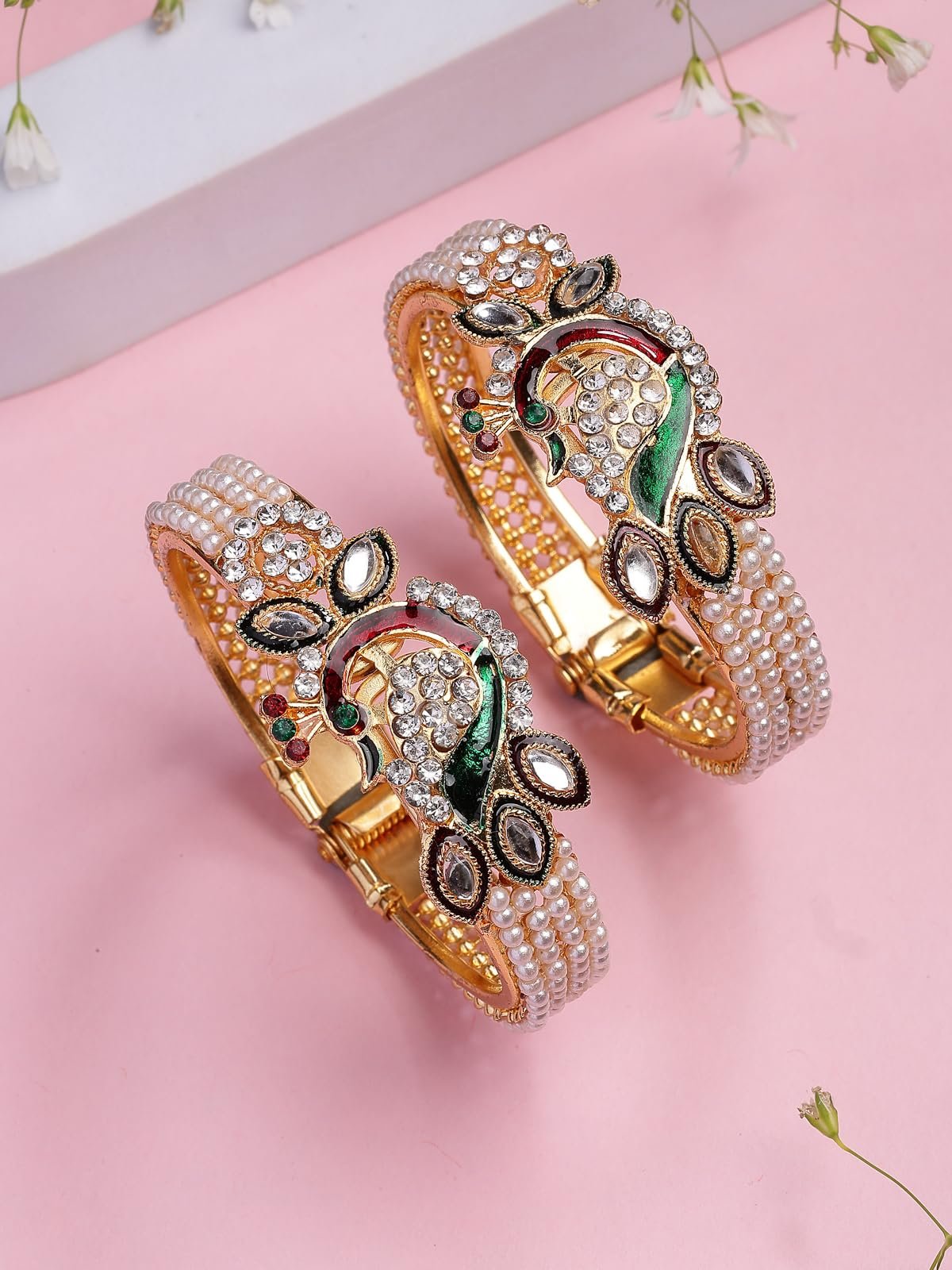 - Peacock-Inspired Design: These bangles feature a detailed peacock shape combined with traditional Meenakari work, bringing a unique and artistic touch to your look.