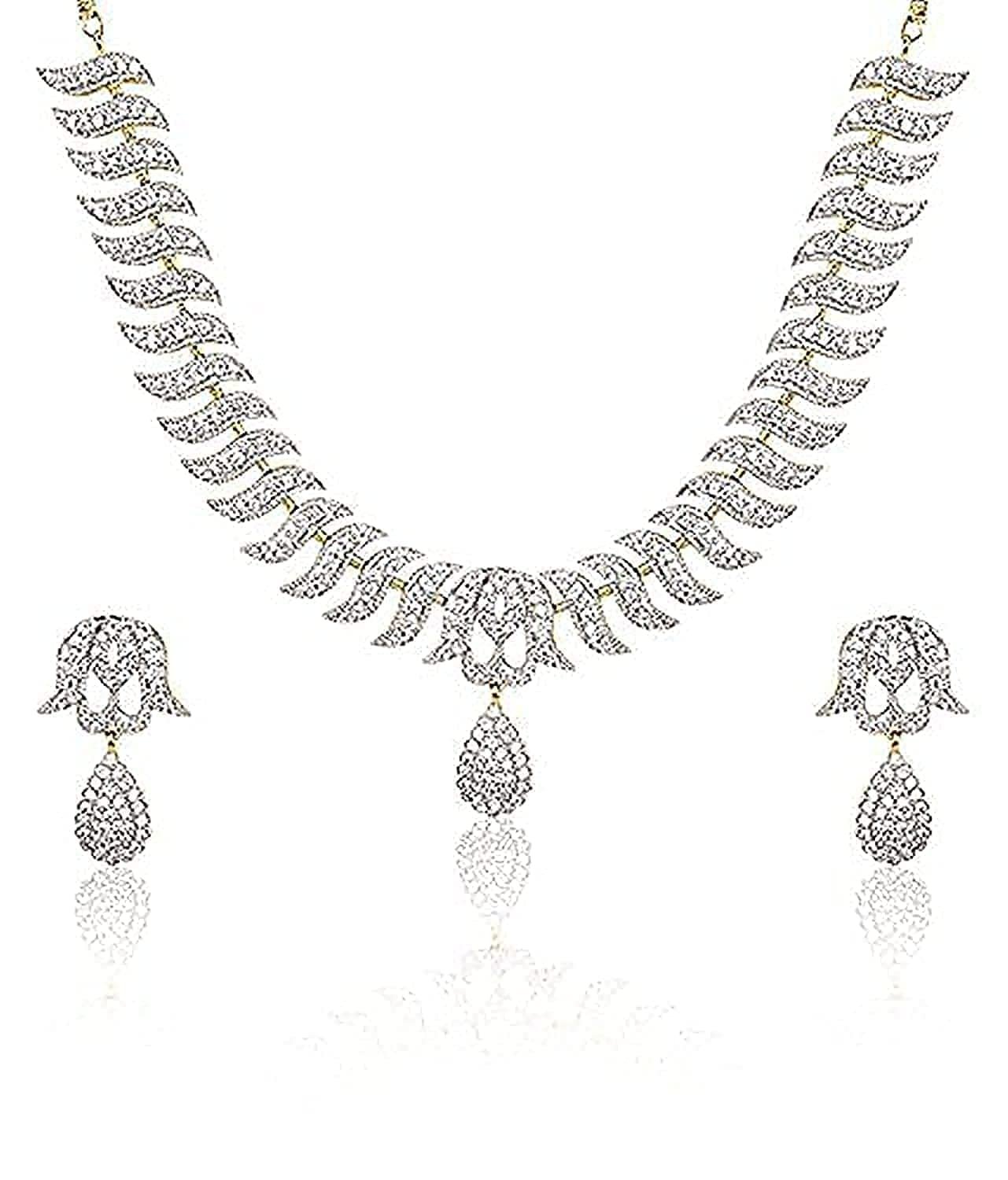 This lovely American Diamond Necklace set from the house of You Bella has been exclusively designed for you. This Beautiful AD Necklace Set is studded with real look-alike American Diamonds, along-with Semi-Precious Ruby / Emerald / Sapphire Stones and Kundan. The CZ(Cubic Zirconia) stones used in crafting this elegant Necklace makes it look like real diamond necklace set. For Shine and Protection, this just like real diamonds necklace set is Gold plated with 18 karat Gold and Rhodium. Pair of matching tops complements this CZ Necklace set, making it the perfect fit for any party or special occasion its graceful design complements with any ethnic or western outfit.