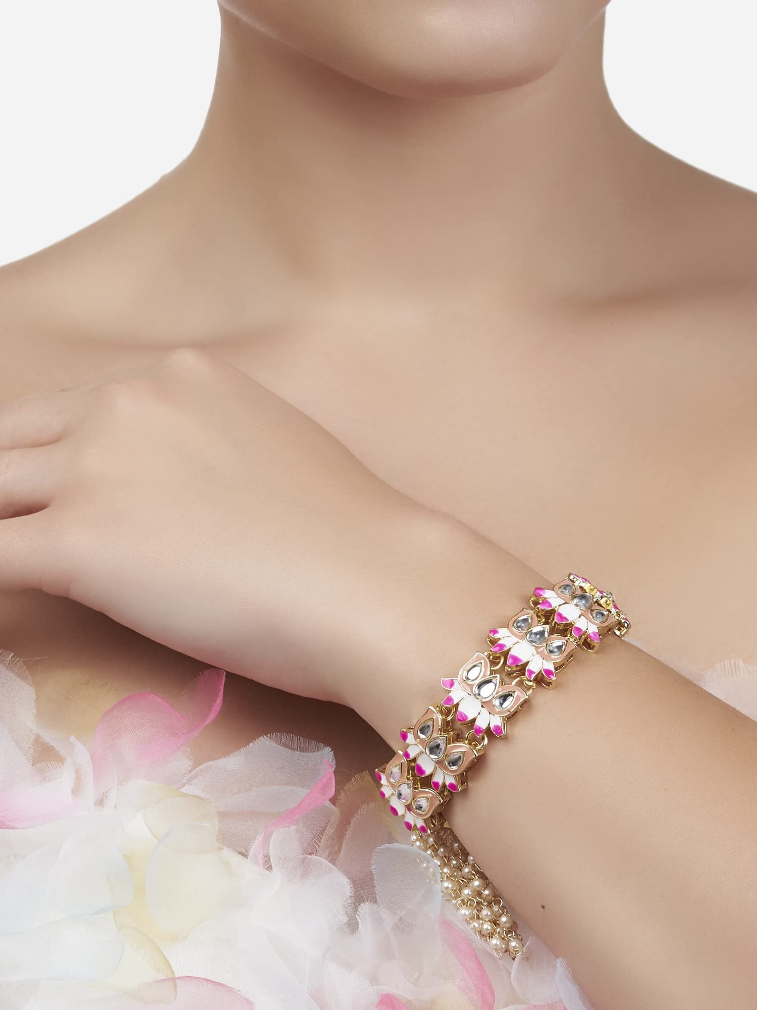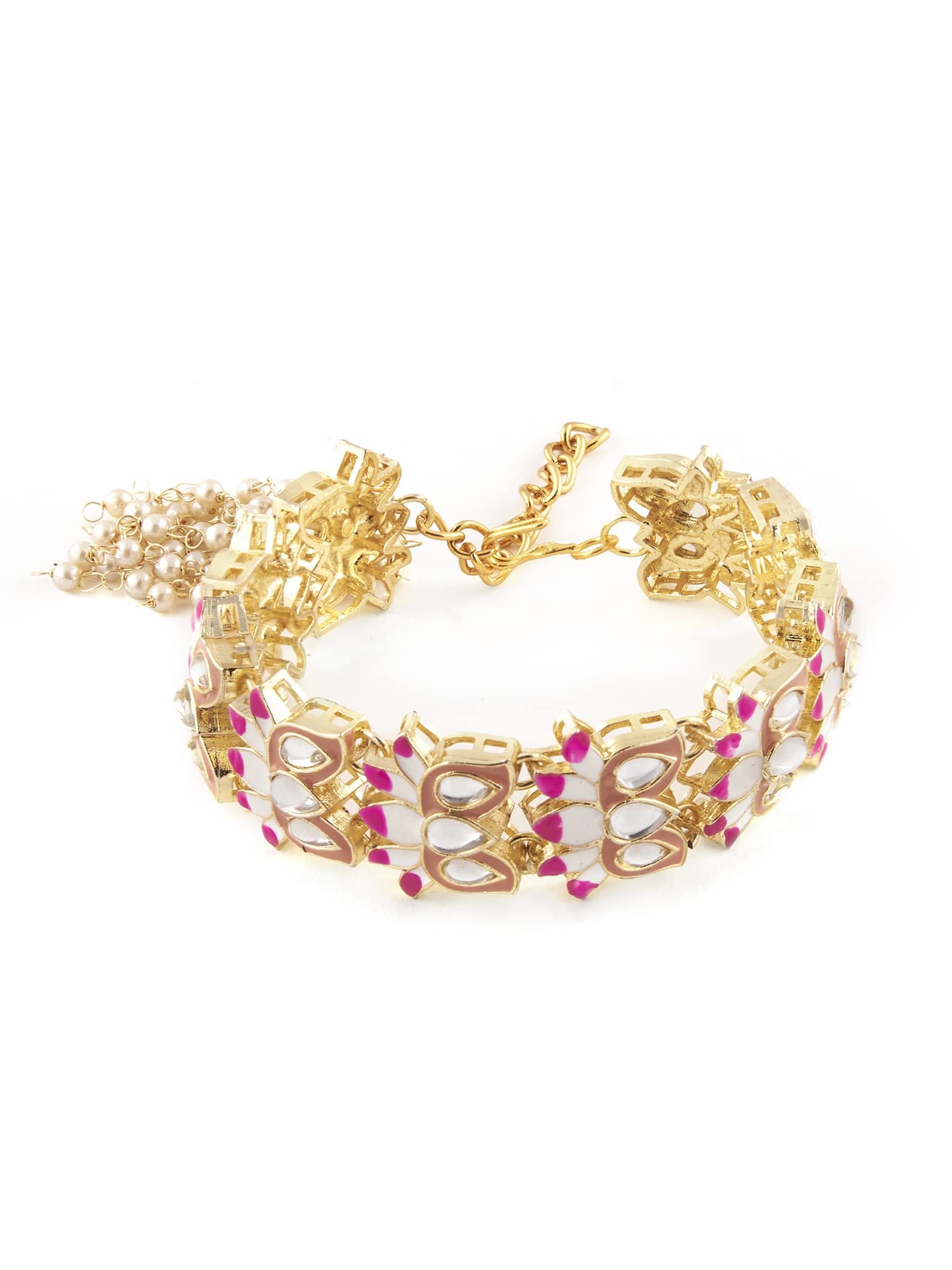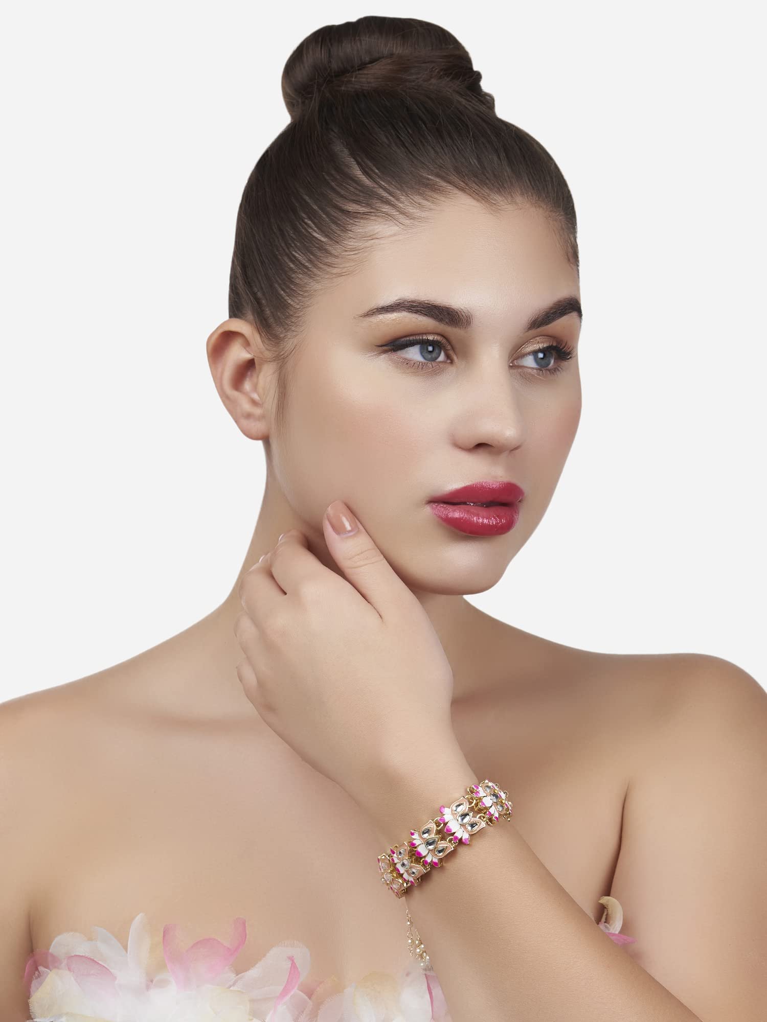 • Features: Bracelets Are An Easy Way Of Amping Up Your Outfit. This kundanf Bracelet Design Is Very Fashionable, Subtle And Trending Which Is Embellished With meenakari in lotus design. Most Often To Be Worn At weddings Or Festives, This Bracelet Can Be Paired With Ethnic outfits In Rich Colours.