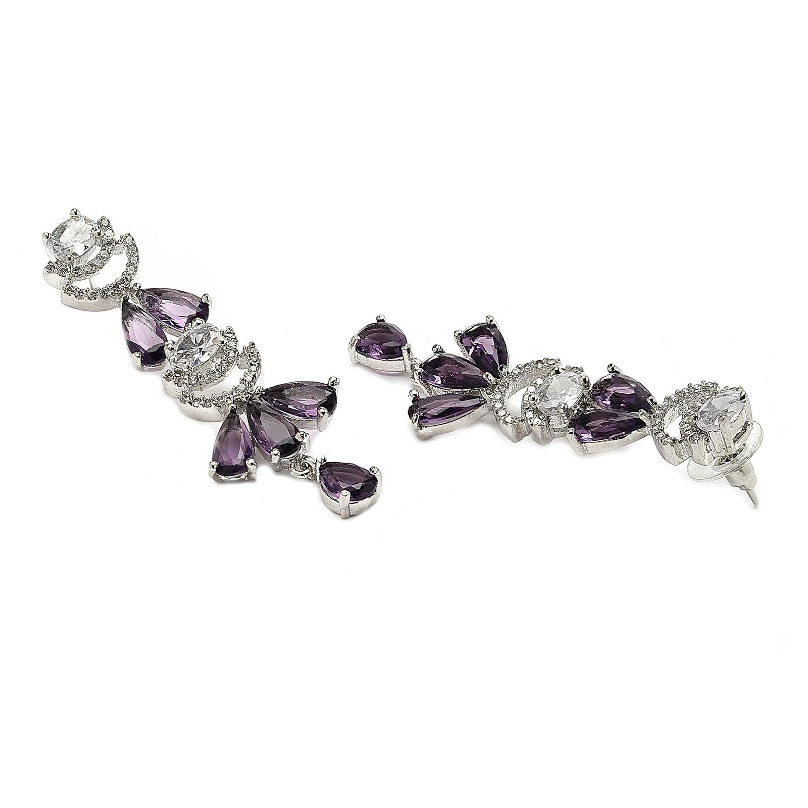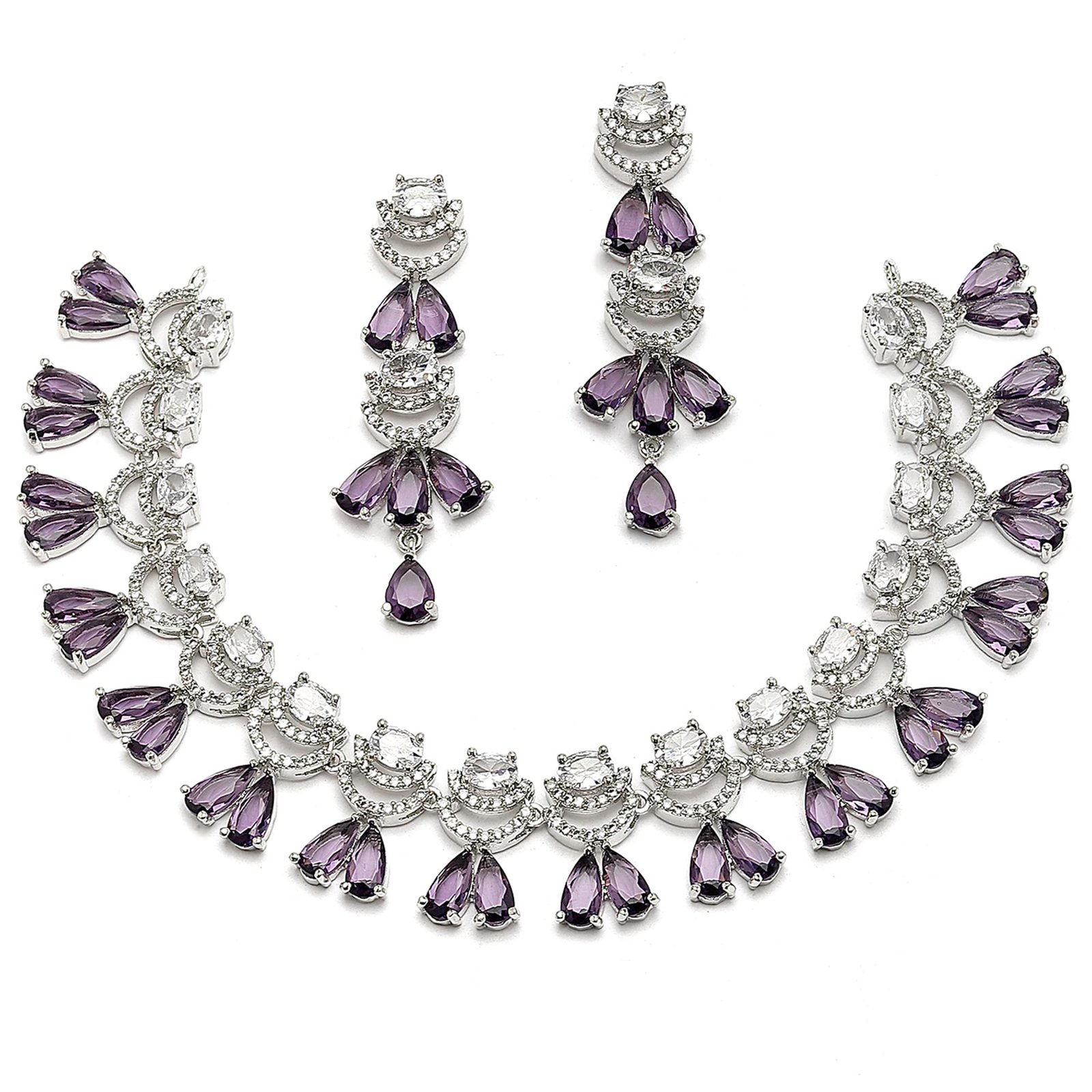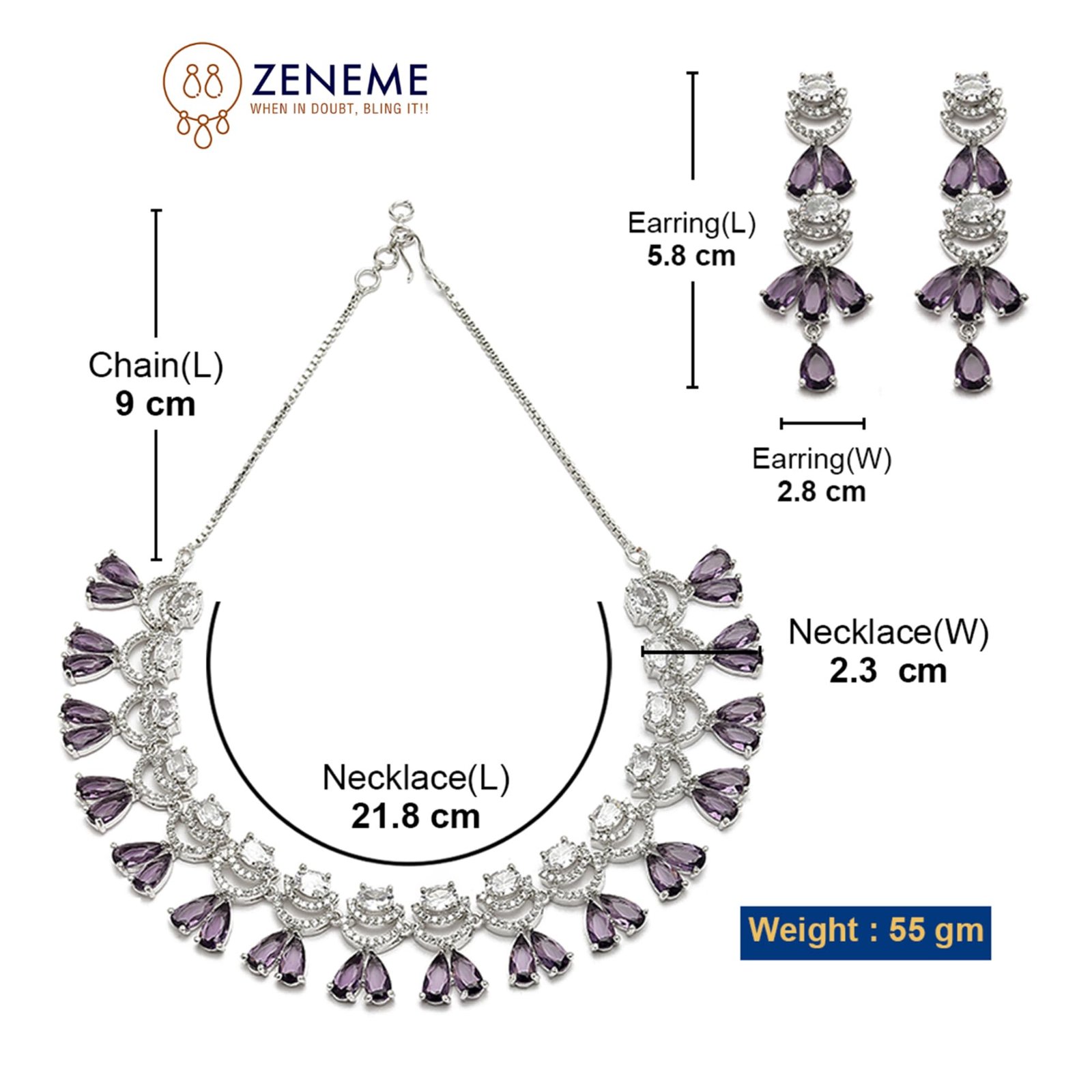 Add a touch of elegance to your special-occasion look with this Zeneme Rhodium Plated Silver Toned American Diamond Jewellery Set. Designed with exquisite craftsmanship, this set features sparkling American Diamonds arranged in a graceful, timeless pattern. The rhodium-plated silver tone enhances the shine and provides a long-lasting, tarnish-resistant finish. Perfect for weddings, festive celebrations, parties, and evening events, this lightweight jewellery set beautifully complements both traditional and contemporary outfits, adding a sophisticated sparkle to your ensemble.